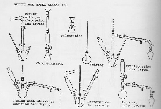 | This is a comprehensive set, fully equiped to carry out almost any organic chemistry procedure, and is ideal for both academic and industrial research workers. Consisting of 84 items all the 28 assemblies illustrated could be assembled with this set. | ||